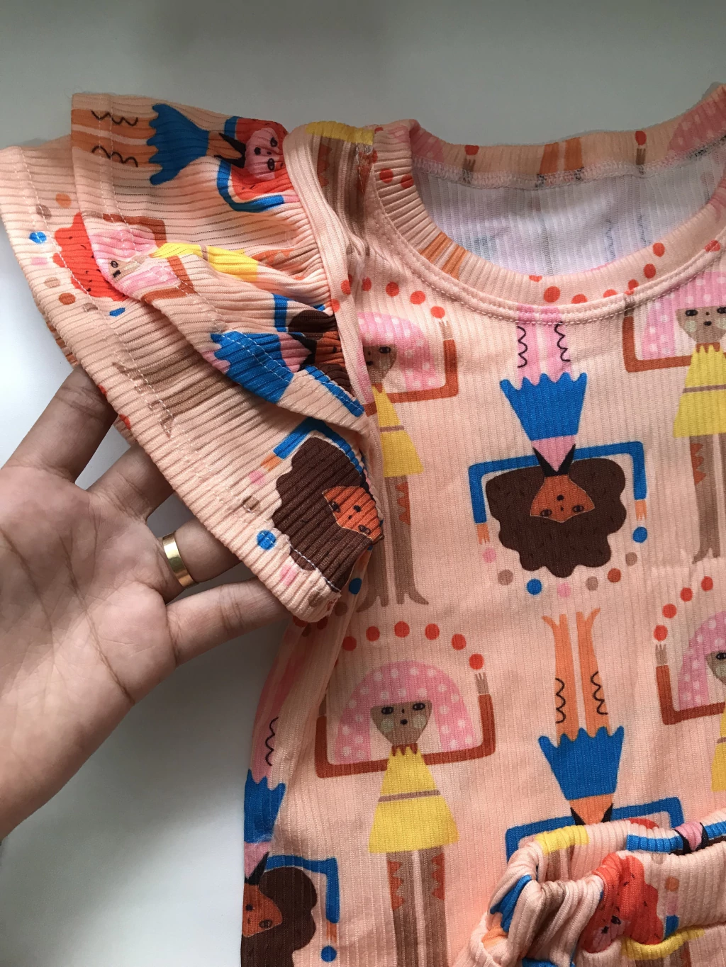 A blusa apresenta delicados babados nas mangas, trazendo um toque de charme e feminilidade ao visual. Sua estampa lúdica e divertida garante que a sua pequena se destaque em qualquer ocasião.