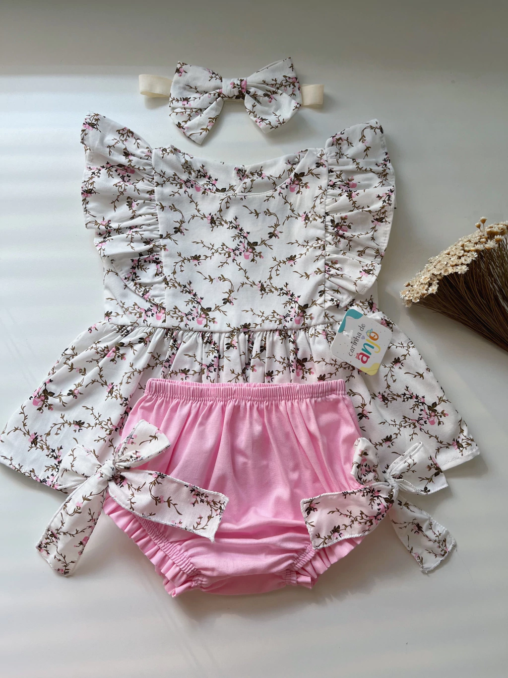 Confeccionado em tricoline 100% algodão, este conjunto é leve e arejado, ideal para os dias quentes do Brasil. A batinha apresenta um caimento soltinho, que garante total liberdade de movimento para a sua bebê, enquanto as mangas franzidas adicionam um charme especial à peça.