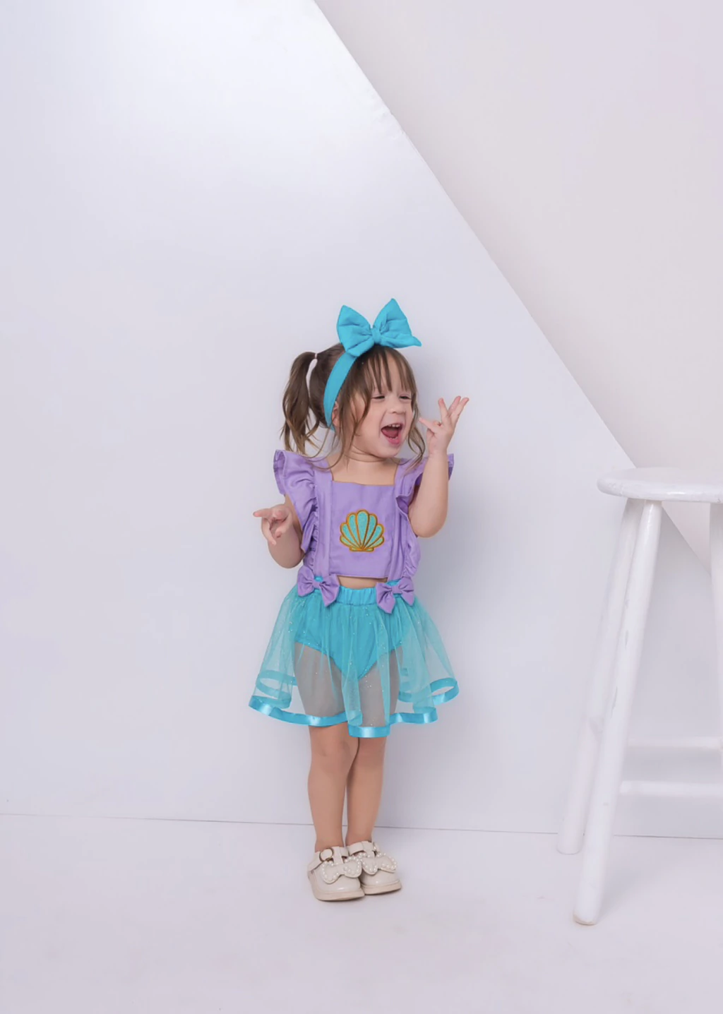 A saia é um verdadeiro encanto: delicadamente adornada com tule por cima, ela traz um toque de magia a qualquer ocasião. Os laços nas laterais adicionam um charme especial, enquanto o bordado no busto confere um detalhe exclusivo e elegante.