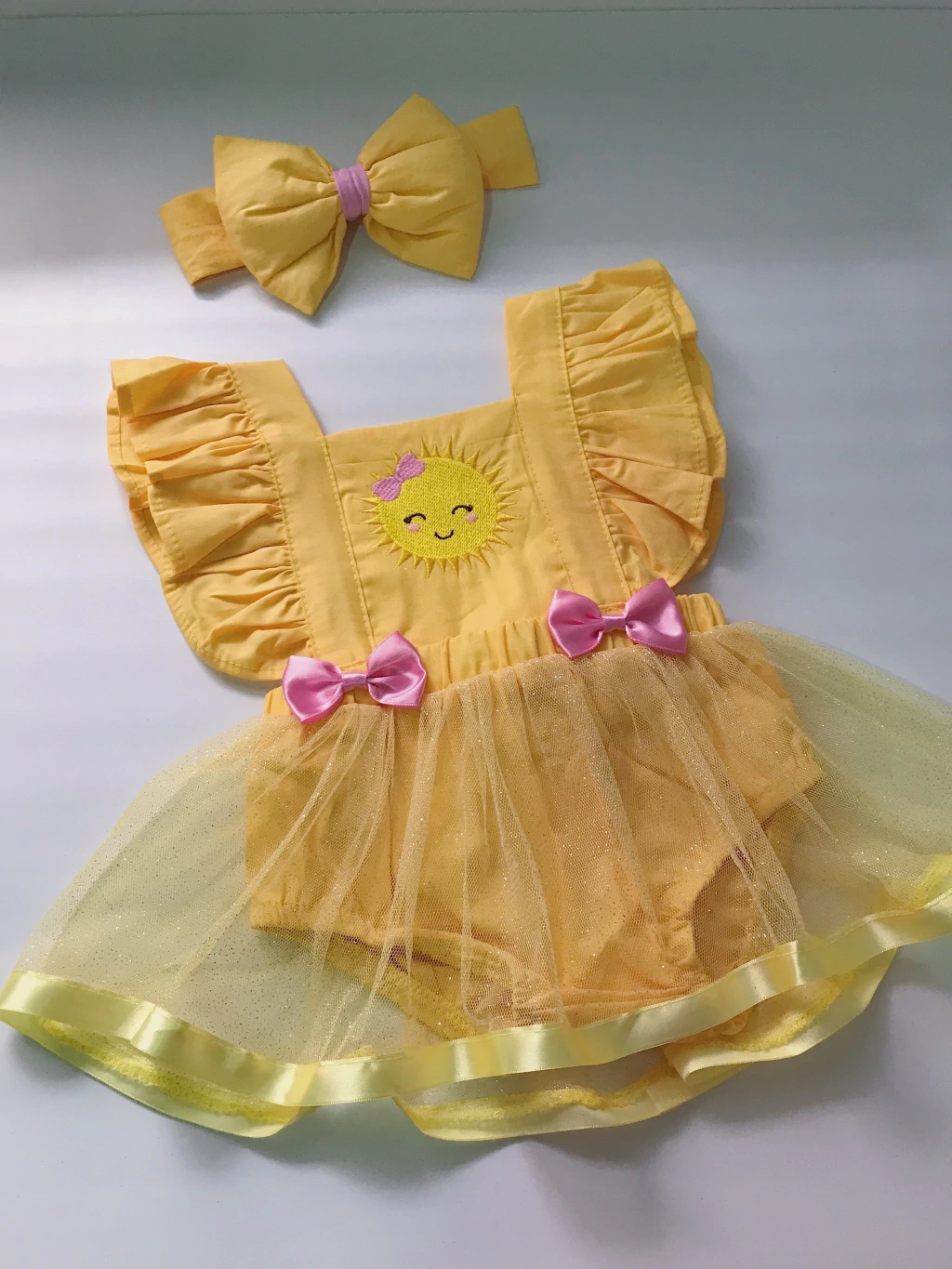 Apresentamos o nosso deslumbrante romper temático Raio de Sol de luxo, confeccionado em tecido Tricoline 100% algodão, que une conforto e sofisticação em uma peça única. Com alças reguláveis e um elástico de ajuste na cintura, ele se adapta perfeitamente ao corpo, garantindo liberdade de movimento para as pequenas.