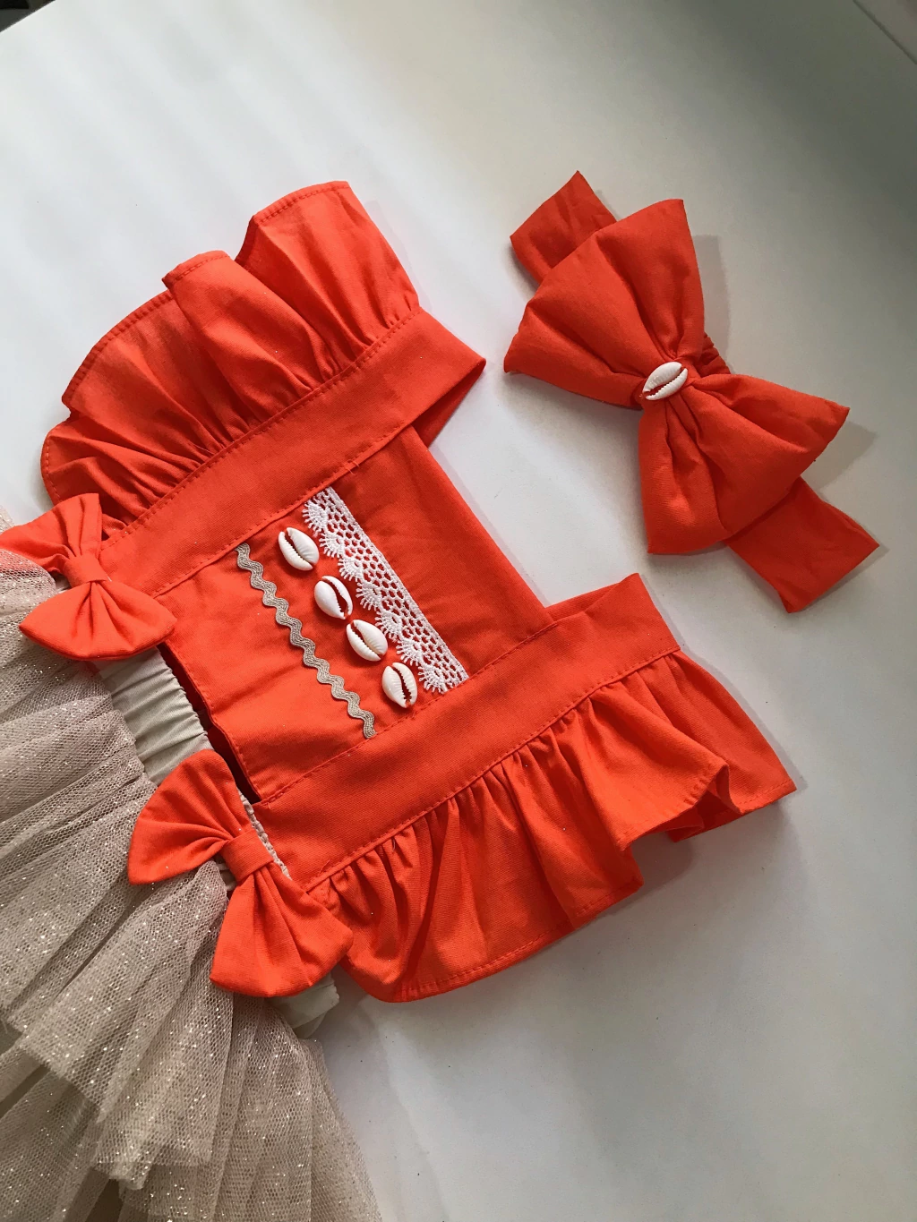 O busto é adornado com aplique de concha e rendinha, trazendo um toque sofisticado e temático. As alças reguláveis e o elástico na cintura proporcionam conforto e ajuste ideal. Por baixo da saia, o romper possui tapa-fralda para maior praticidade.