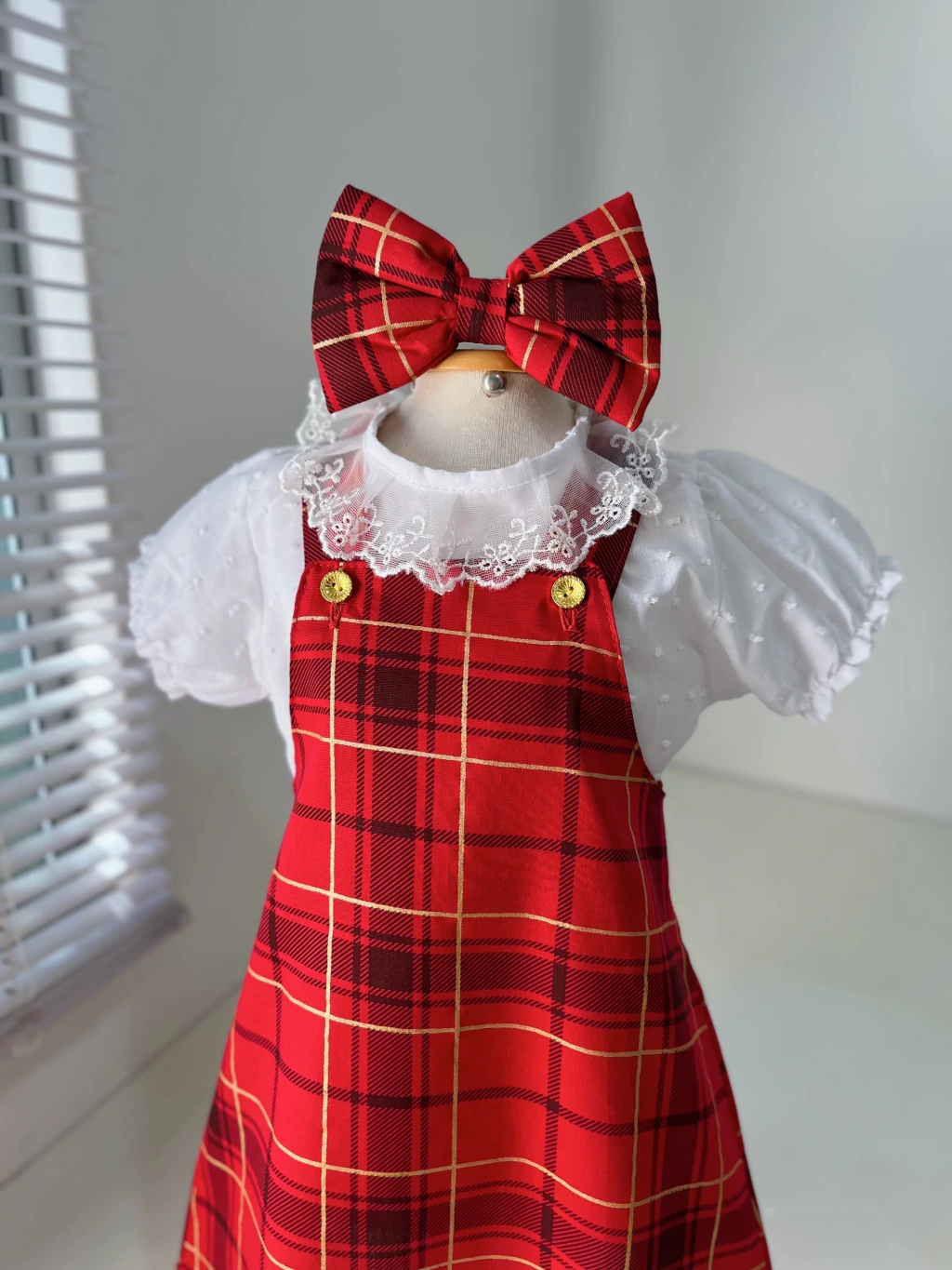 A salopete xadrez vermelha é a escolha perfeita para quem busca um look cheio de charme e personalidade! Confeccionada em 100% algodão, ela possui dois botões para ajuste de tamanho, garantindo um encaixe confortável enquanto sua pequena cresce. Acompanhada de uma blusa branca em tecido pipoquinha, com delicada gola de renda, essa combinação é irresistível! Para completar o visual, um laço de cabelo no bico de pato adiciona um toque especial e encantador. Ideal para passeios e ocasiões especiais, esta salopete é puro estilo!