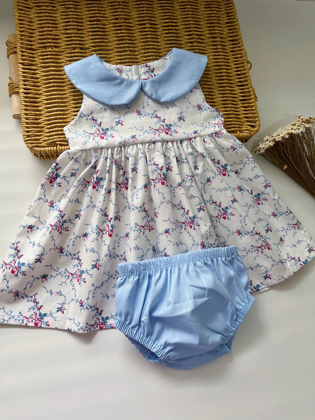 O design sofisticado traz uma gola redonda delicada e botões de ajuste nas costas, permitindo um caimento perfeito e personalizado. Além disso, acompanha um tapa fralda combinando, que complementa o look com praticidade e charme.